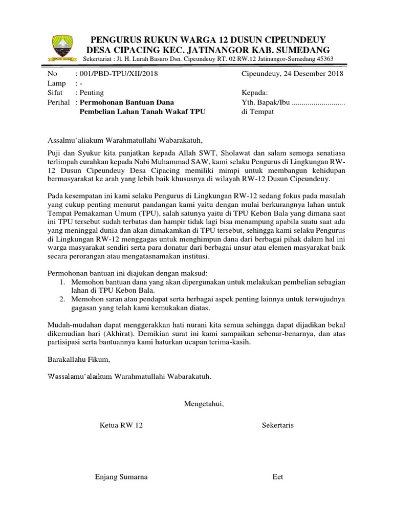 Surat Permohonan Bantuan Pembelian Tanah Wakaf Tpu Rw 12 Cipeundeuy Pdf